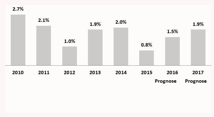 Für die Schweizer Wirtschaft stand das Jahr 2015 im Zeichen der Aufhebung des Mindestkurses, welche zu einem tiefen BIP Wachstum von 0,8% geführt hat. Für das Jahr 2016 wird ein moderates Wachstum von 1,5% erwartet.