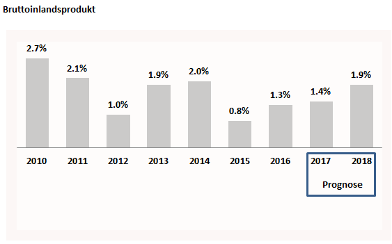 In den vergangenen drei Quartalen beschleunigte sich das Wachstum der Schweizer Wirtschaft zwar, es blieb aber hinter den Erwartungen zurück. Die freundlichen weltwirtschaftlichen Aussichten lassen eine Beschleunigung der wirtschaftlichen Dynamik in den kommenden Quartalen erwarten. Für 2017 wird ein BIP Wachstum von 1,4% erwartet, 1,9% für 2018. (Quelle: SECO).