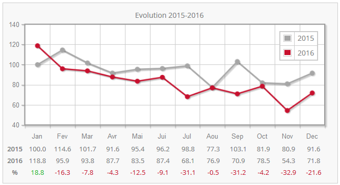 En 2016, l’indice était de 12,9% inférieur à celui de l’année précédente. L’indice a ainsi diminué de 20% environ au cours des deux dernières années.